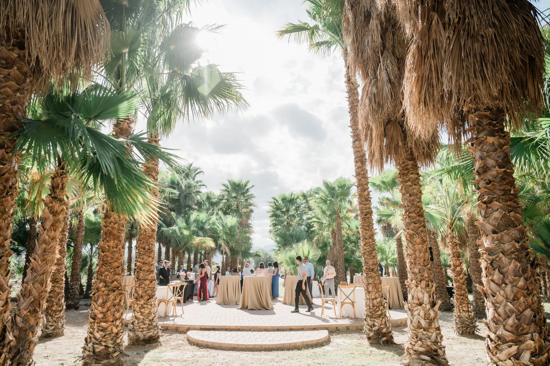 A secret opening in the palm forest reveals a 2,000 sq ft paved round platform, perfect for ceremonies, dining, and cocktail experiences surrounded by twinkling string lights.